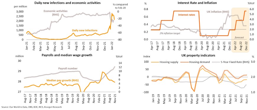 The UK economy could face major challenges, including higher daily COVID-19 cases and rising cost of living. It has seen about 150k cases a day since the detection of Omicron. This has brought economic activities to the lowest level since May 2021 although the Prime Minister has maintained ‘no more lockdowns’ to avoid economic contraction. At its December meeting, the Bank of England surprised markets by lifting interest rates for the first time since the pandemic, by 15 bps to 0.25% to curb rising prices. Looking ahead, there are also surprises for policymakers. We expect UK households to experience a deterioration in living standards as wage is slowing down while cost of living continues to rise. This could hurt consumer purchasing power at least until inflation peaks in 2Q22. In addition, property affordability remains subdued as housing demand exceeds supply and higher mortgage rates push up mortgage payments. However, payrolls have continued to increase and exceed pre-crisis level, which could support consumer demand. The stable labor market, coupled with above-target inflation, would allow the BOE to consider further rate hikes to about 0.75% by the end of this year.
