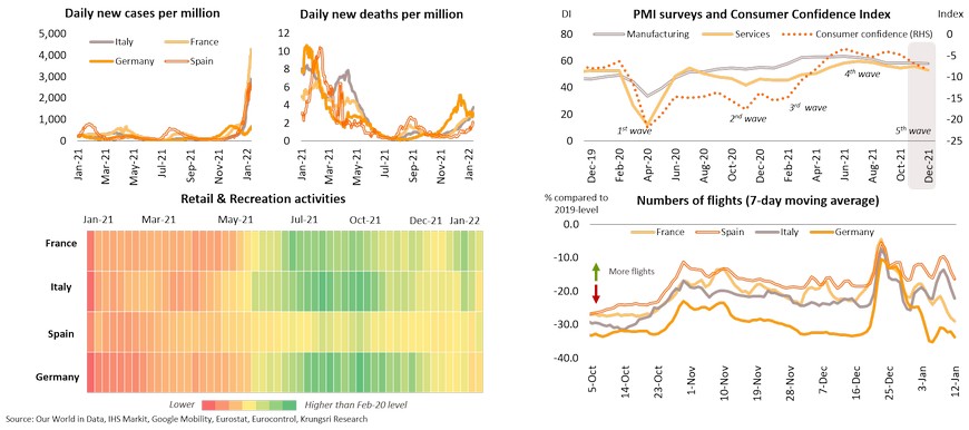 Omicron will hinder economic growth in the Eurozone in early-2022. Daily new cases are breaking records in many countries, led by France and Spain. This has hurt services activities, reflected by the 8-month low Services PMI index in December. Consumer Confidence Index in the same period was dented by rising COVID-19 cases and concerns over inflation, which sent the index below pre-crisis level. Despite Omicron being more infectious and disruption to services activities, the impact is expected to be less severe than during previous outbreaks because it causes milder symptoms and fewer fatalities. Signs of easing supply bottlenecks could also support the manufacturing sector, which could partly offset the negative economic impact of the outbreak. Furthermore, high-frequency data show milder interruptions to retail and recreation activities than prior waves. Activities in major countries remain stronger than Feb-20 levels. Lastly, countries did not halt air transportation, and the number of flights in major countries is only 10-30% below 2019-levels. Hence, we expect the latest outbreak to have limited impact on the economy and overall activities would resume from late-1Q22 onwards.