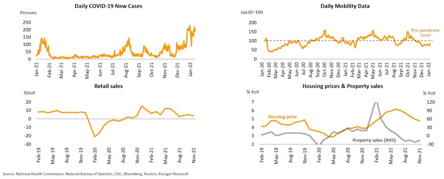 There is still uncertainty over China’s economic growth trajectory, although the power shortage situation that started last year has eased. Since August 2021, China has experienced several waves, including the latest which started in December in Zhejiang, Henan, Shaanxi, Tianjin and Liaoning (these 5 provinces contribute 18.2% of national GDP). Despite recording much fewer cases than in other major economies, China’s strict containment measures are discouraging economic activities, indicated by a drop in daily mobility data to below pre-pandemic level and weaker retail sales growth since late 2021. China is expected to maintain its ‘zero-COVID policy’ throughout this year. In addition, real estate developers are struggling with a liquidity crunch. Evergrande’s debt instruments have been downgraded by global credit rating agencies to ‘restricted default’ status, while other developers including Kaisa and Shimao have defaulted on their latest interest payments. The latest developments in the property sector have shaken confidence and pushed down property sales and prices. Moreover, regulators will continue to crackdown on technology giants, unlike the broad regulatory onslaught last year. That would deter business investment ahead. Looking forward, recent outbreak amid China’s ‘zero-COVID policy’, low liquidity in the property sector, and regulatory crackdown, would dampen domestic spending in several areas and investment in some sectors.