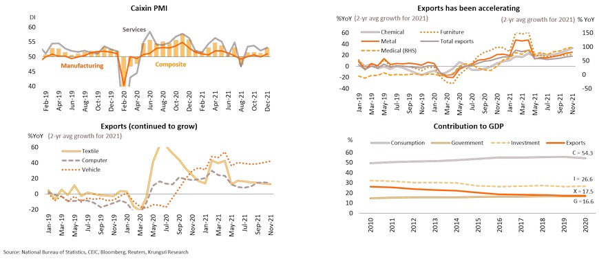 Several headwinds are hampering economic growth prospects but some key economic indicators are improving. Manufacturing PMI turned to expansion territory in December, suggesting easing impact of electricity shortage and supply disruption. The Output sub-index posted the strongest growth in a year, while delivery time component eased. Besides, external demand is resilient as 2-year average growth has accelerated to 18.4%, the strongest growth since April. Among the top 10 export items, pandemic-induced and work-from-home policy-related products (including medical products and furniture) remained buoyant, while demand for chemicals and metals are gaining momentum. In addition, demand for vehicles and computers (contribute combined 29.9% of total exports) will continue to grow going forward. However, exports - which contributed 17.5% of national GDP – would be insufficient to offset weaker consumption (54.3% of GDP) and investment (26.6% of GDP). And, port congestion has worsened because of strict containment measures at major gateways and temporary halt at some manufacturing sites, which could be a key risk factor for China's exports.