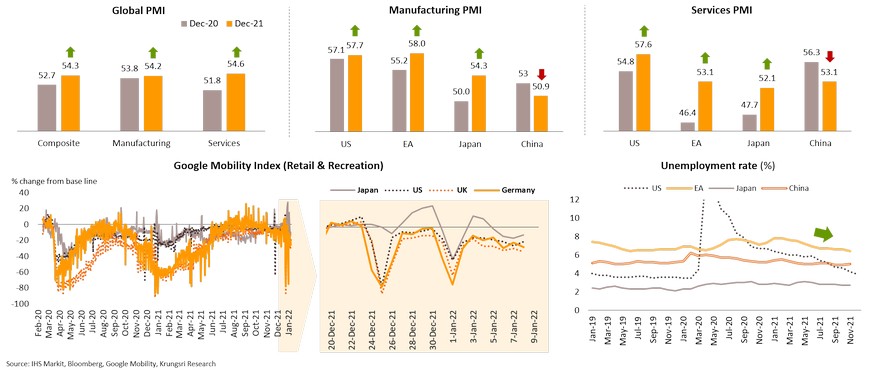 Global economic activities had improved markedly in 2021. Though supply-side problems limited growth in the manufacturing sector, services sector recovered strongly amid progress in vaccination in advanced countries. Most major countries, except China, registered stronger growth in 2021. The Omicron wave since late-2021 might hurt some activities, especially services, but it would have limited impact because of milder symptom and lower fatality rate amid higher vaccination rates. Economic recovery is underway with falling unemployment, allowing several countries to normalize crisis stimulus programs.