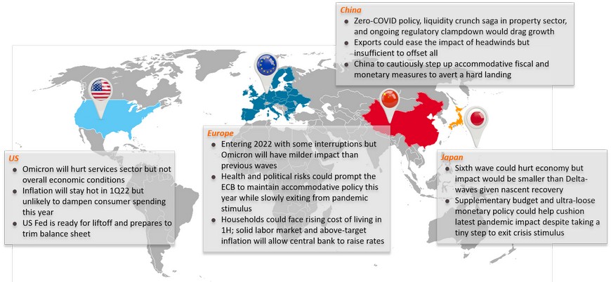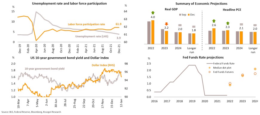 A robust labor market, persistent inflation, milder COVID symptoms, and more hawkish Fed members, are supporting a faster-than-expected rate hike. Even with disappointing payrolls, the labor market might have reached maximum employment. Unemployment rate plunged to 3.9% in December last year, better than the Fed’s projection of 4.3%, while labor force participation rate is about 1.5% below Feb-20 level. The Fed expects Omicron to have only mild impact on the economy, reflected by the upward revision of 2022 GDP growth. In addition, investors are optimistic about the economy and had driven 10-year treasury yield to 1.7% early this year and caused the Dollar to appreciate. We see rising probability of the first-rate hike in March 2022, followed by at least 2 more hikes before the end of the year. The FOMC estimates rates would hit 0.9% by 2022 and 1.6% in 2023, suggesting a continuity of the hiking cycle. Moreover, the Fed might start to trim balance sheet (quantitative tightening) soon after starting to lift rates. This aggressive tightening could raise concerns in stock and currency markets worldwide but we maintain that global liquidity would remain abundant and is unlikely to drop sharply.
