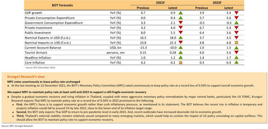 In December, headline inflation dropped to 2.17% YoY from 2.71% in November, following the policy to cap domestic diesel price. But, raw food prices rose because of higher pork prices. Core inflation (excluding raw food and energy prices) was stable at 0.29%. For full-year 2021, headline and core inflation averaged 1.23% and 0.23%, compared to -0.85% and 0.29% in 2020, respectively. Looking ahead, inflationary pressure is likely to rise more than expected, particularly in the first half of this year, driven by rising energy prices and the AFS outbreak at pig farms which have pushed up prices of pork and related and substitute products. However, inflationary pressure would be capped by Thailand’s policy to freeze prices for several types of energy and some key necessities, as well as weak wage growth.