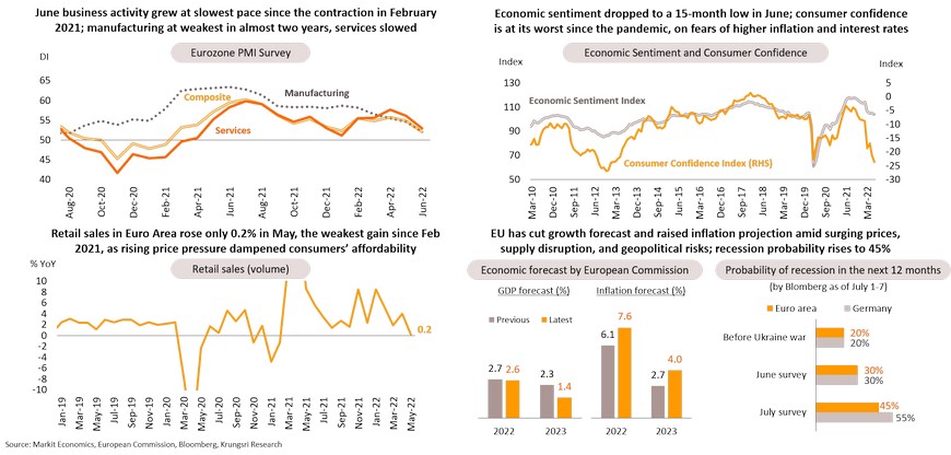 Eurozone: Economy is heading towards stagflation; weaker sentiment and spending amid fears of higher inflation and interest rates; EU has cut economic growth forecasts