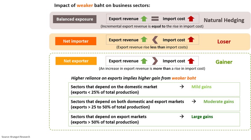 Sector-wise, natural hedging dictates the weaker baht would hurt sectors which are net importers but benefit sectors with large exposure to exports