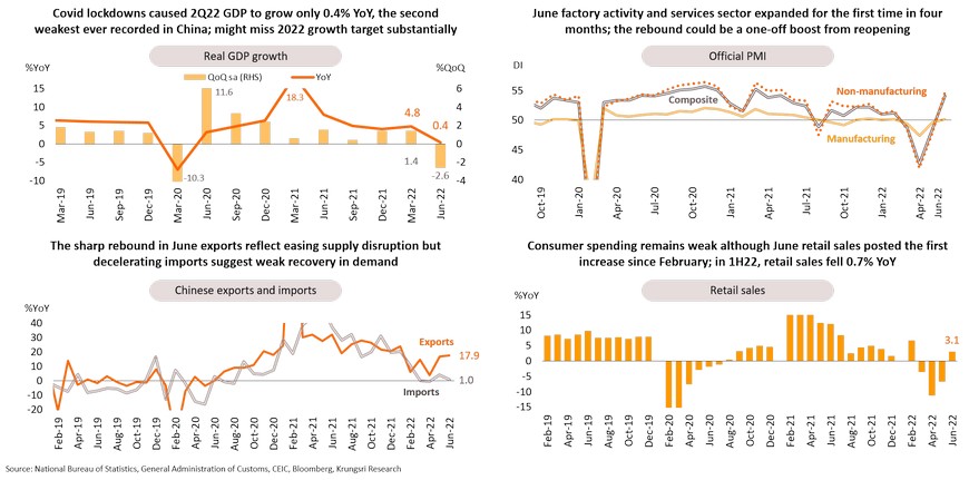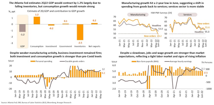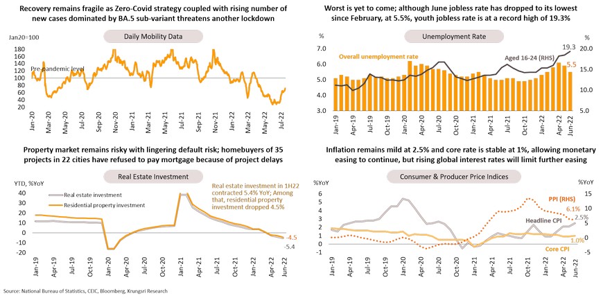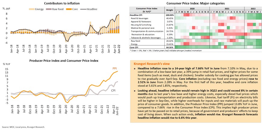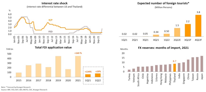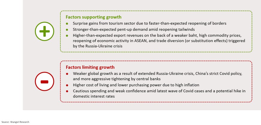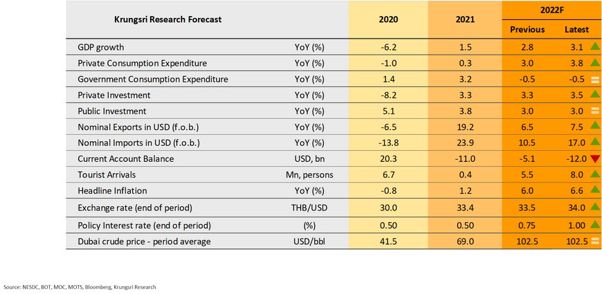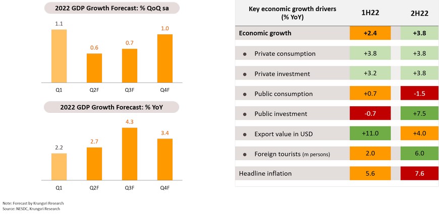 - Krungsri Research has fine-tuned 2022 GDP growth forecast to +3.1% to reflect better-than-expected growth in 1H22 and improving tourism activity, but overall, economic recovery remains fragile.