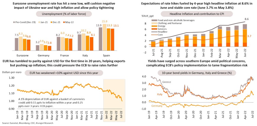 Despite recession risk, ECB might continue to raise rates given tight labor market, high inflation, and EUR parity with USD; need to step up efforts to ease fragmentation risk