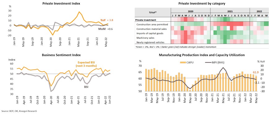 Private investment is likely to recover gradually in 2H22, supported by (i) positive signal in the Business Sentiment Index which rose for the second consecutive month to above-50 for the first time in 3 months, (ii) better-than-expected export growth in some sectors; (iii) recovering domestic economic activity after lifting containment measures and border controls and reopening of economic activity. However, private investment growth would be limited as manufacturing production and capacity utilization rate are improving very slowly due to supply disruption in some industries which were hit by the Russia-Ukraine crisis and China’s strict Covid measures.