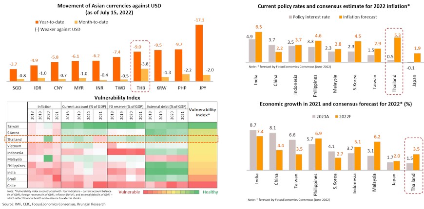 So far this year (as of July 15, 2022), the Thai baht has weakened by 9.0% against the USD to a 16-year low, in line with several of other currencies in the region such as the PHP (-9.7%), KRW (-9.5%), and TWD (-7.4%). The weaker baht could increase export revenues but could also hurt businesses through higher import costs.