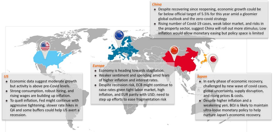 China: Despite recovering since reopening, economic growth could be far below official target of 5.5% for this year amid a gloomier global outlook and the zero-covid strategy