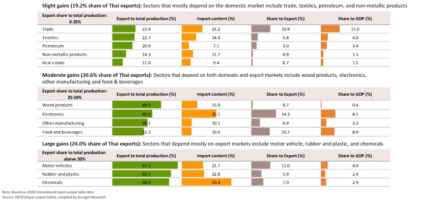 - Mild gains (19.2% share of Thai exports): Export sectors that depend strongly on the domestic market include trade, textiles, petroleum, and non-metallic products.