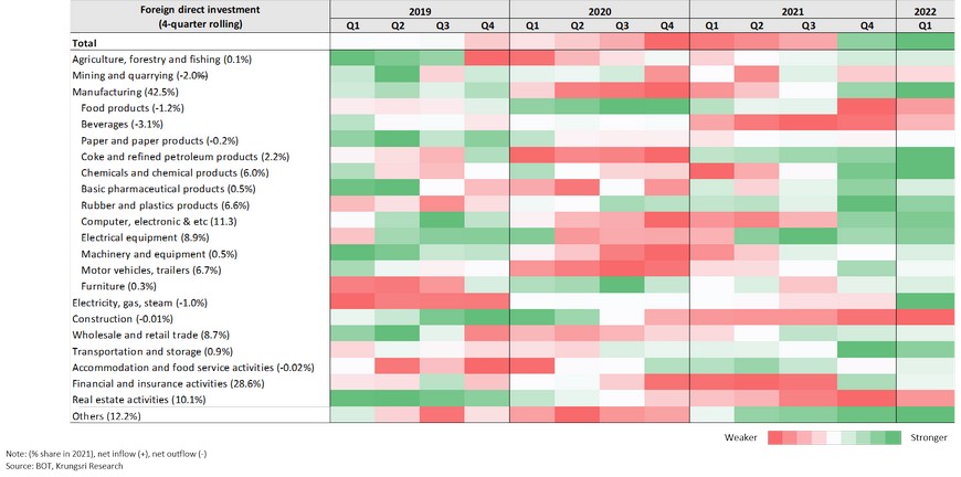 - Private investment could see a gradual recovery. Despite improving business sentiment with reopening tailwinds, weak manufacturing production would cap investment growth. Foreign Direct Investment (FDI) has turned to register net inflows in many industries, including rubber products, chemical products and electrical equipment. However, external headwinds could limit gains.
