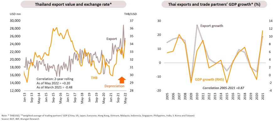 In the past 2 years, correlation between baht movement and export value was weak at only 0.20, suggesting the weaker baht would not lead to a sharp increase in Thai exports. However, there is strong correlation between Thai export growth and trading partners’ GDP growth, implying that export performance would depend on external demand rather than exchange rates.