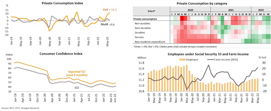 Krungsri Research projects private consumption would grow by 3.8% in 2022 (instead of 3.0%) and against 0.3% in 2021. We expect 2H private consumption growth to be similar to 1H. Tailwinds for consumer spending in 2H22 would include easing containment measures, improving employment numbers, rising farm income, and high excess savings (THB1,349 bn or 8.2% of GDP at end-April 2022). Nonetheless, consumption growth would be stable because upside would be capped by rising cost of living in the wake of higher energy prices and the pass-through effects on consumer prices. Although the government has extended relief measures by 3 months (ending in September), these would only help low-income earners and those holding social welfare cards. Other headwinds for consumption include possibly higher interest rates, unwinding of government subsidies, and very-low consumer confidence as well as high household debt.