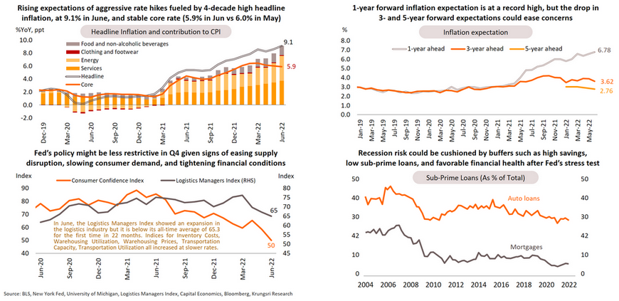 To quell inflation, Fed might continue with aggressive tightening and hike rate by 75 bps in July; slower rate hikes in Q4 and some buffers could help US to avert a recession