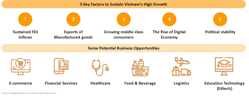 A strong growth path of 6.0% -7.0% p.a. is expected to be resumed in the post-pandemic era due to Cambodia’s favorable trends. These include sustained inflows of FDI, exports of manufactured goods – garment and footwear products, increasing middle-class consumers, the rise of digital economy, as well as political stability. In our view, against this backdrop, business opportunities for both local and foreign investors arise, particularly in the sectors such as e-commerce, financial services, healthcare, food and beverage, logistics, and education technology (EdTech).