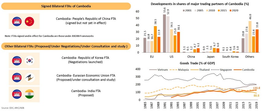 Cambodia has recently been active in engaging bilateral free trade agreements (FTAs) with its trading partners to help gain greater market access and to diversify export markets. Over the past two decades, Cambodia has been crucially dependent on the US and the EU for its exports, mainly garments and footwears. Diversification of export markets has become vital for the country following the EU’s decision to partially suspend tariff-free access to the bloc’s single market in 2020. Currently, Cambodia is in talk with countries like South Korea, and India for FTAs following its first free trade deal with China signed in October 2020.
