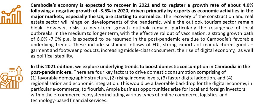Cambodia’s economy is expected to gradually recover and likely to expand in the range of 3.0% - 4.0% in 2021 following a negative growth of -3.5% in 2020 due to the adverse impact of the pandemic at home and abroad. Key growth drivers – exports, tourism, and construction – have been paralyzed. However, in 2021, a partial pickup of domestic demand at home and economic recovery of major markets will support Cambodia’s economy. Risks to growth stem mainly from resurging of local outbreaks leading to renewal of lockdown and other containment measures. These would weigh on economic activities and could hinder the recovery.