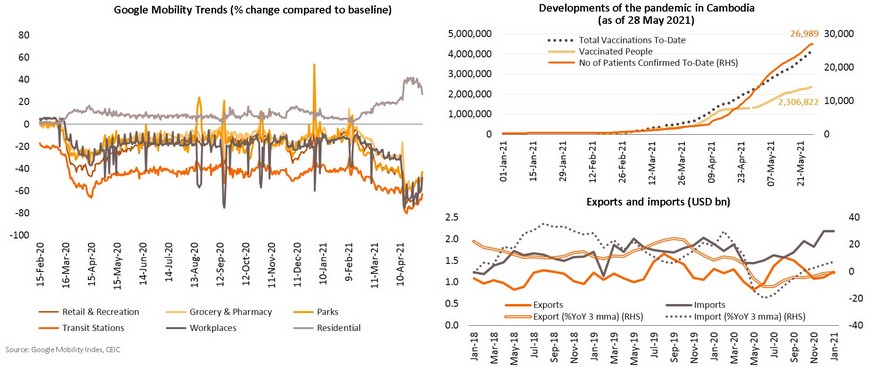 The recent local outbreaks started in February 2021 have led to lockdowns in Phnom Penh and major cities. As a result, economic activities have dropped substantially reflected by the Google Mobility Trends. This will weigh on t the economy and could delay the recovery in 2021; however, the impact would hinge on the government support packages and the effective of vaccination program. In addition, a pickup in exports would be a tailwind to nurture Cambodia’s early stage of the economic recovery in 2H2021.