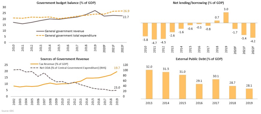 Debt sustainability remains manageable for Cambodia. In the medium term, the government may need to run budget deficits to nurture the economic recovery in the post-pandemic world.