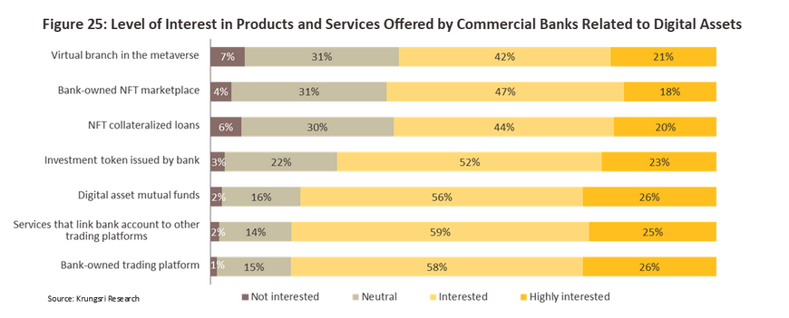 Given this, it is likely that if commercial banks did indeed expand their involvement in markets for digital assets, both those who already have a trading account and those who have never opened one would become more interested in trading in digital assets. In this context, the Thai market is, in order of importance, most interested in seeing commercial banks: opening their own trading platforms, linking their bank accounts to other trading platforms, and offering mutual funds based on digital assets.
