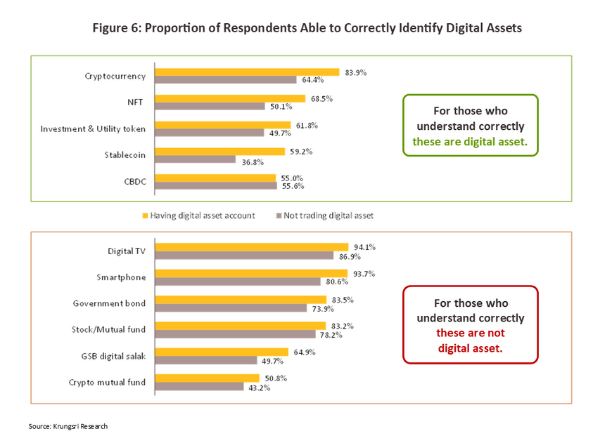Respondents were clearly able to correctly identify cryptocurrencies, NFTs, CBDCs, and digital tokens as different types of digital assets, but they also misidentified mutual funds as an actual or potential digital asset. Even though some mutual funds do indeed invest in digital assets (e.g., in cryptocurrencies), the mutual fund itself is still not considered to be a digital asset, and a cryptocurrency-based mutual fund is not regarded as being fundamentally different from mutual funds that invest in other assets, such as bonds, equities, gold, oil, or real estate.To further investigate knowledge of digital assets, the survey respondents were split into two groups: those who held an account for trading in digital assets and those without. Among the former, almost two-thirds (64.9%) correctly answered that prize bonds4/ (the GSB digital salak) are not a type of digital asset according to the definitions given in the 2018 declaration on digital businesses. However, among those without a trading account, the proportion giving a correct answer fell to just half.