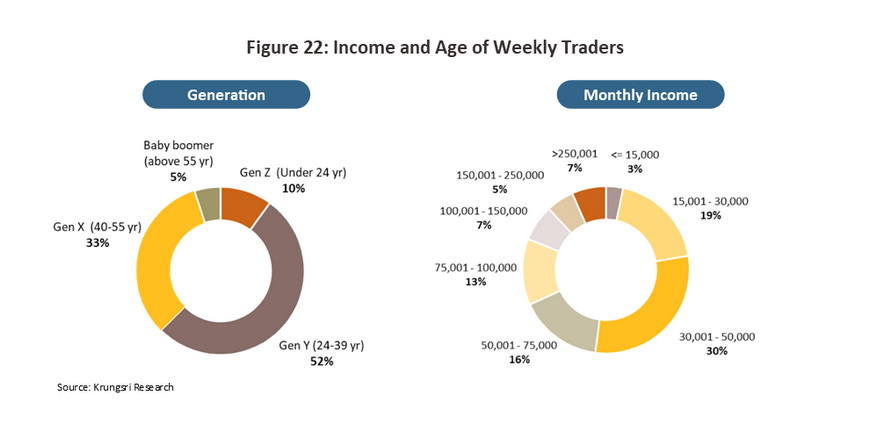 The Krungsri Research survey indicates that the appeal of these types of services is equally high in Thailand, with 8 in 10 of all respondents reporting that they would be interested in financial products related to digital assets if these were sold by commercial banks. Of those who expressed an interest in these products and services, the greatest share (63%) was accounted for by those who had never opened a digital asset trading account. This group was followed in importance by those who traded intermittently or as opportunities arose (25%) and in equal third place on 6% each were those who traded at least weekly and those who had opened a trading account but who had never traded. In addition, the data show that those who worked in the banking and financial sector were twice as likely as those who worked in other industries to express an interest in financial products and services released by commercial banks that were related to digital assets.