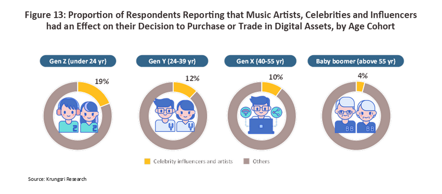 It is also interesting to note that around a tenth of all respondents reported that music artists, celebrities, and influencers had an impact on their decision to purchase, or invest or trade in digital assets. Among Gen Z respondents, this proportion rose to 1 in 5, while the proportion fell back to 1 in 10 for both Gen Y and Gen X. Because only a limited number of baby boomers responded to the survey, it is not possible to be certain how important this factor was for older individuals.