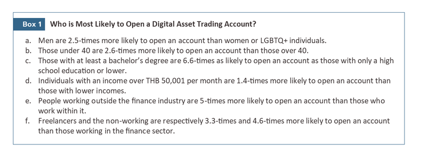 Analysis of the survey data reveals that individuals most likely to open a digital asset trading account are men who are less than 40-years old, have at least a bachelor’s degree, earn over THB 50,001 per month, and do not work in finance. Account holders are also likely to be not working or to be self-employed. The fact that those working in the finance industry are less likely to invest in digital assets than those not in the industry may be explained by the fact that people inside the finance sector are likely to be more exposed to news and information about traditional types of investment and speculation. They may therefore be more confident in the latter than in markets such as those for cryptocurrencies, which are still new and are viewed as being highly risky.