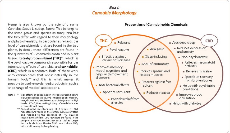 Hemp may be used in a great number of applications, including as a relaxant, a sleeping aid, a remedy for dizziness, and as a cure for headaches and migraines (Box 1). In addition, all of the plant may be used for commercial purposes, from its flowers, through the leaves, seeds and branches to the exterior and interior of the stalks, and even the roots, all of which may be processed into a remarkably wide range of products (Box 2). Thus, the flowers can be processed for the extraction of medicinal phytocannabinoids[3], including CBD (which may be consumed directly or used to generate added value by being mixed with foods and drinks, or by being processed into personal care or cosmetic products) and terpenes (used to make perfumes and essential oils). The leaves may be used in the production of food and beverages, or to make organic fertilizer, building materials, fiberboard and fiberglass. With regard to the stalks, the outer layer can be used to make fiber, clothes, rope, lightweight and high-quality bullet-proof body armor, paper-making pulp, packaging materials, heat insulators, and bioplastics, while the lightweight inner parts of the stalks are used in construction to produce blocks and hempcrete, as well as in auto assembly and furniture production. Oils and other extracts from the seeds find applications as food additives and in the manufacture of personal care products, since these have a high nutritional value (they are rich in protein, vitamin E and omega oils).