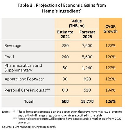 Krungsri Research has assessed the value of the Thai hemp industry through a consideration of the potential of downstream manufacturers and their consumption of hemp, together with an assessment of the proportion of total hemp output that will be diverted to each end user[5]. The results of this analysis are given below.