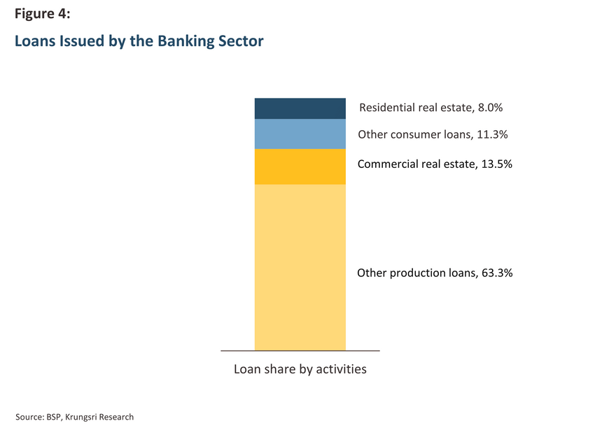For the types of loans, the majority of lending by the banking sector is issued as credit to businesses in the manufacturing and service sectors. Lending by UKBs is focused principally on non-financial corporates (NFCs) that are part of mixed conglomerates operating principally on the domestic market in industries as varied as real estate, agro- and food-processing, retail and wholesale, construction, and telecommunications. Of these, the most important is commercial real estate (CRE), which generates 13.5% of all loans (Figure 4). By contrast, lending by TBs and RCBs is generally directed at retail and small-business borrowers. In the case of TBs, these are typically auto and motorcycle loans, home loans, and funding for household businesses, while for RCBs, loans are generally made in support of small-scale or household enterprises engaged in activities in the manufacturing or agricultural sectors.