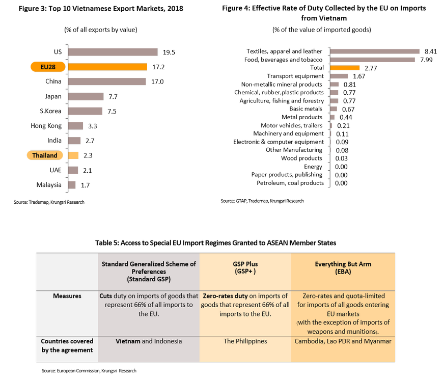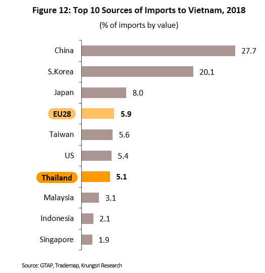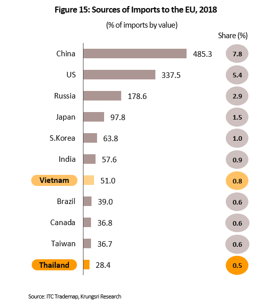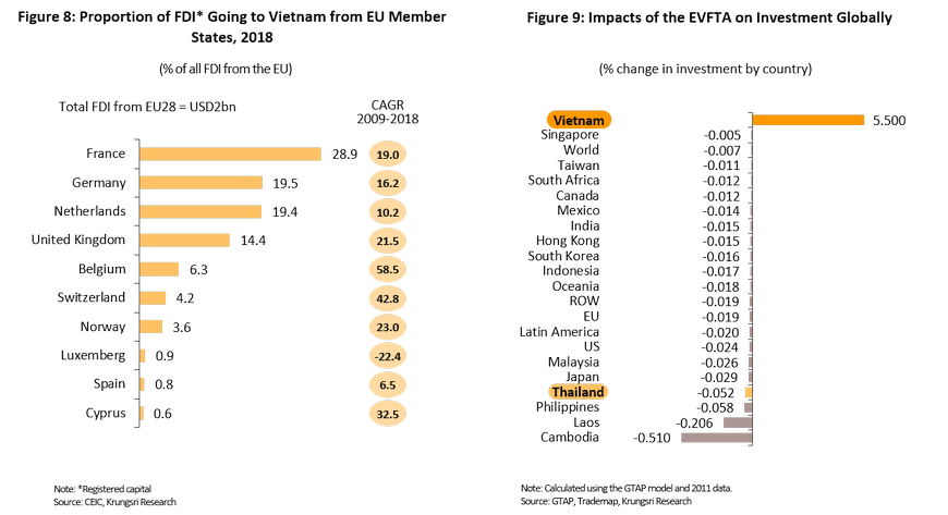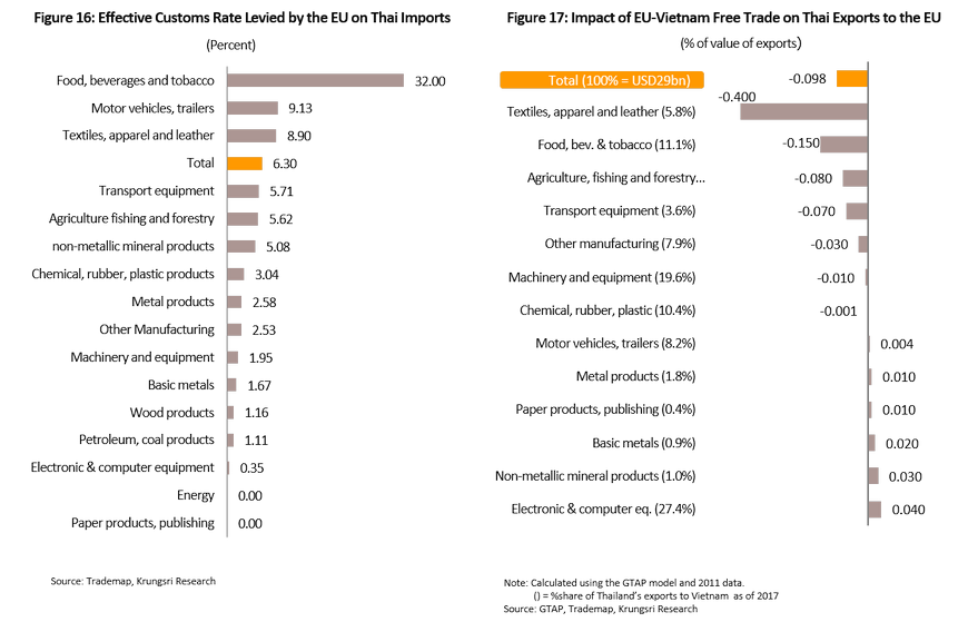 Krungsri Research believes that overall, the EVFTA will have a positive impact on the development of the Vietnamese economy over the long term, especially on exports and investment and this will lead to a greater level of economic growth. Analysis using the GTAP model (Table 8) shows that exempting all Vietnamese imports to the EU from customs duties will have positive impacts across the Vietnamese economy, leading to a 28.0% rise in the value of Vietnamese exports, a 5.5% increase in investments, and a 0.267% combined boost to economic growth. Exports that will benefit most strongly from this will include textiles, leatherwear and footwear, food, beverages and tobacco, transport equipment and agricultural, fisheries and forestry goods. However, from Thailand’s point of view, this is an unwelcome development because the impacts of EVFTA enforcement will be largely negative, and total exports, investment and economic growth will all suffer as a result. Although the analysis indicates that in strictly numerical terms, the initial impact will be limited, Thailand will (apart from the signatories themselves) be among the countries most heavily affected by the EVFTA, with exports of transport equipment, consumer goods, machinery and equipment, and electronics the most seriously disrupted. Most importantly, the signing of the EVFTA will help lift total Vietnamese exports even further and there is a danger of Vietnamese exporters increasingly leaving their Thai competitors further and further behind. Indeed, in 2019, with a value of USD 263 bn compared to USD 246 bn, Vietnamese exports pulled ahead of those from Thailand for the first time (Figure 18).