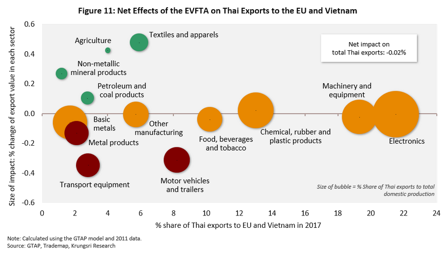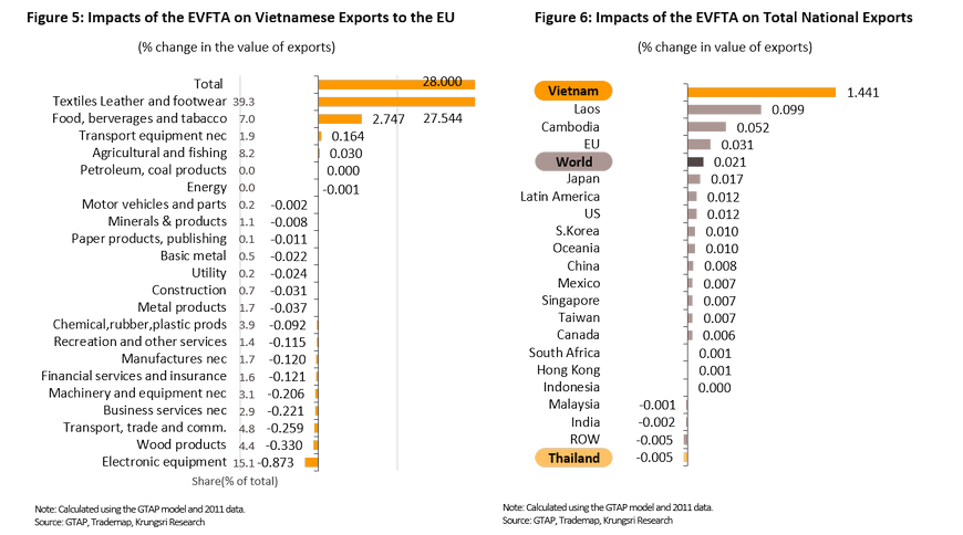 Comparing the impacts of the EVFTA on Vietnam and other countries, the value of Vietnamese exports are expected to grow by 1.44%. Other countries will also see benefits for their export sectors and overall, the world economy will expand by 0.02% but the situation for Thailand is less positive, and of all the countries affected, Thai exports are likely to see the strongest negative impacts (Figure 6).