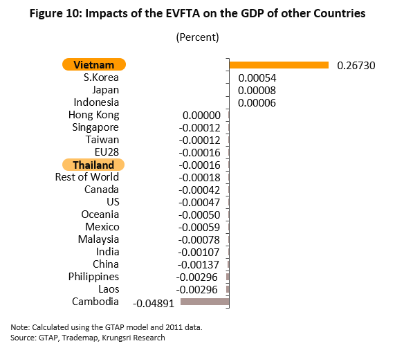 In light of the boost to exports and investment, and the lift given to competitiveness by exempting Vietnamese exports to the EU from its import duties, Vietnam’s economy is forecast to grow by 0.267%, while for many other countries, including Thailand, the economic impacts are expected to be negative. Most seriously affected will be Cambodia since the country’s exports are strongly reliant on the EU (the bloc accounts for 40% of all Cambodian export sales) and the structure of Cambodian exports is similar to those of Vietnam, with a strong emphasis on clothing and finished garments.