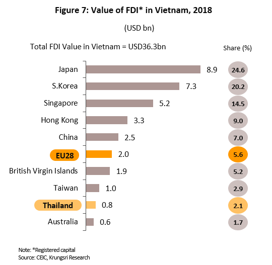 Currently, the EU is the 6th most important source of investment funds for Vietnam and foreign direct investment (FDI) from the bloc comes to a total of roughly USD2bn per year, or 5.6% of all FDI received by the country (Figure 7). In terms of investment targets, the biggest recipients of EU FDI are manufacturing, electricity generation and real estate.