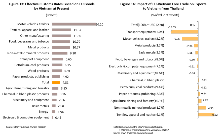 At present, Thailand is an important source of imports to Vietnam (Figure 12). This is because Thai exports are attractive to Vietnamese buyers since both countries are signatories to the ASEAN FTA and so Thai exports have an advantage with regard to their customs rates, but once the EVFTA comes into force, the customs rate levied on EU goods imported into Vietnam will fall from an average of 4.8% (Figure 13) to 0%, and so importers will tend to import more goods from the EU at the expense of Thai products. Work by Krungsri Research shows that in fact, the introduction of free trade between the EU and Vietnam will lead to a -0.17% decline in the value of exports from Thailand to Vietnam (Figure 14) because in the first year of the EVFTA’s operation, 48.5% of products imported from the EU to Thailand will be zero-rated. Goods categories that will tend to be negatively affected in the initial period will include polyethylene (HS390120, HS390210) radio transmitters, modems and wireless LAN equipment (HS851762), diodes and semiconductors (HS854140) and circuit boards (HS854231).