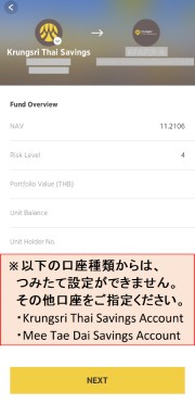 投資信託の口座開設は、最寄りの支店でお手続きいただけます。 支店でお手続き頂く場合、下記の書類をご持参ください。 【必要な持ち物】 ①~⑤をご用意のうえ、口座開設を希望される支店へご来店ください。 ①ご本人のお通帳 ②ご本人のパスポート ③ご本人のノンイミグラントビザ*¹ ④〈保有者の場合〉TAX IDコピー ⑤滞在目的別書類 1点*²*³ *¹観光ビザまたは到着ビザによるお申込みはできません。 *²こちらの表から、滞在目的に合わせてご選択ください。 *³各書類は、英語またはタイ語表記をお願いいたします。翻訳業者による翻訳資料がなければ、お手続きいただけません。 2023年8月16日以降、居住地国名等を記載した届出書の提出が必要となります。 日本国籍のお客さまが口座開設等を行う際、日本のマイナンバーを記載いただきます。 Common Reporting Standard(共通報告基準)については、こちらをご覧ください。 |