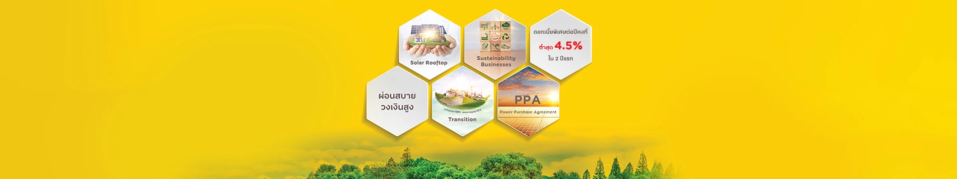 - สินเชื่อเพื่อธุรกิจ PPA (Krungsri SME for PPA) หรือ Power Purchase Agreement อีกหนึ่งสินเชื่อธุรกิจ SME เพื่อสิ่งแวดล้อม สำหรับธุรกิจที่ทำการลงทุนผลิตและขายไฟฟ้าจากพลังงานแสงอาทิตย์ในรูปแบบโซลาร์เซลล์ โดยมีสัญญาซื้อขายไฟให้แก่ผู้ใช้งานซึ่งเป็นหน่วยงานขนาดใหญ่ เช่น รัฐวิสาหกิจ และโรงพยาบาล สินเชื่อ SME เพื่อธุรกิจ ESG นี้เป็นส่วนสำคัญของการพัฒนาที่เป็นต้นแบบเพื่อความยั่งยืน