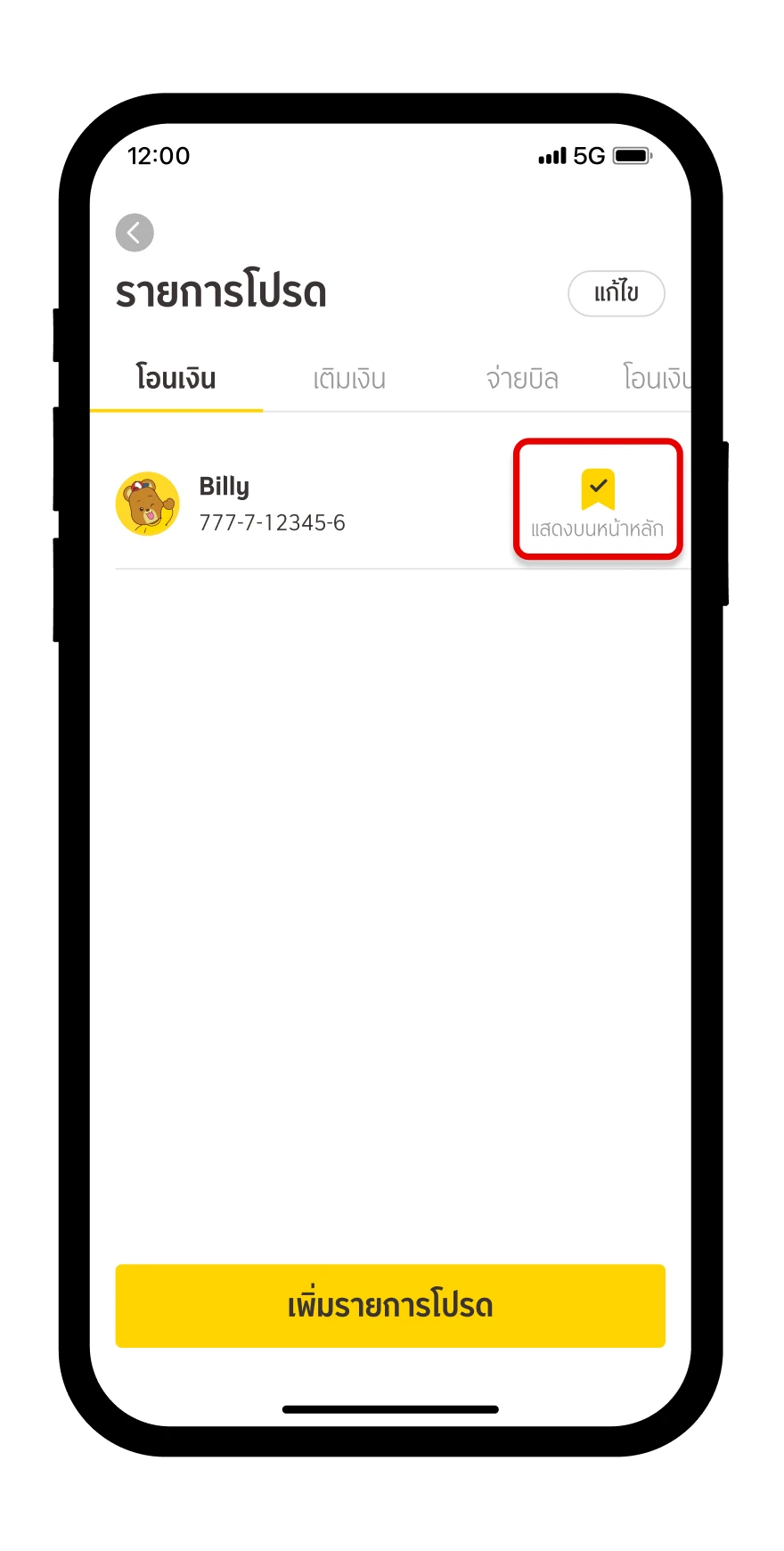 สามารถเลือกแสดงรายการโปรดบนหน้าหลักโดยกด "แสดงบนหน้าหลัก"