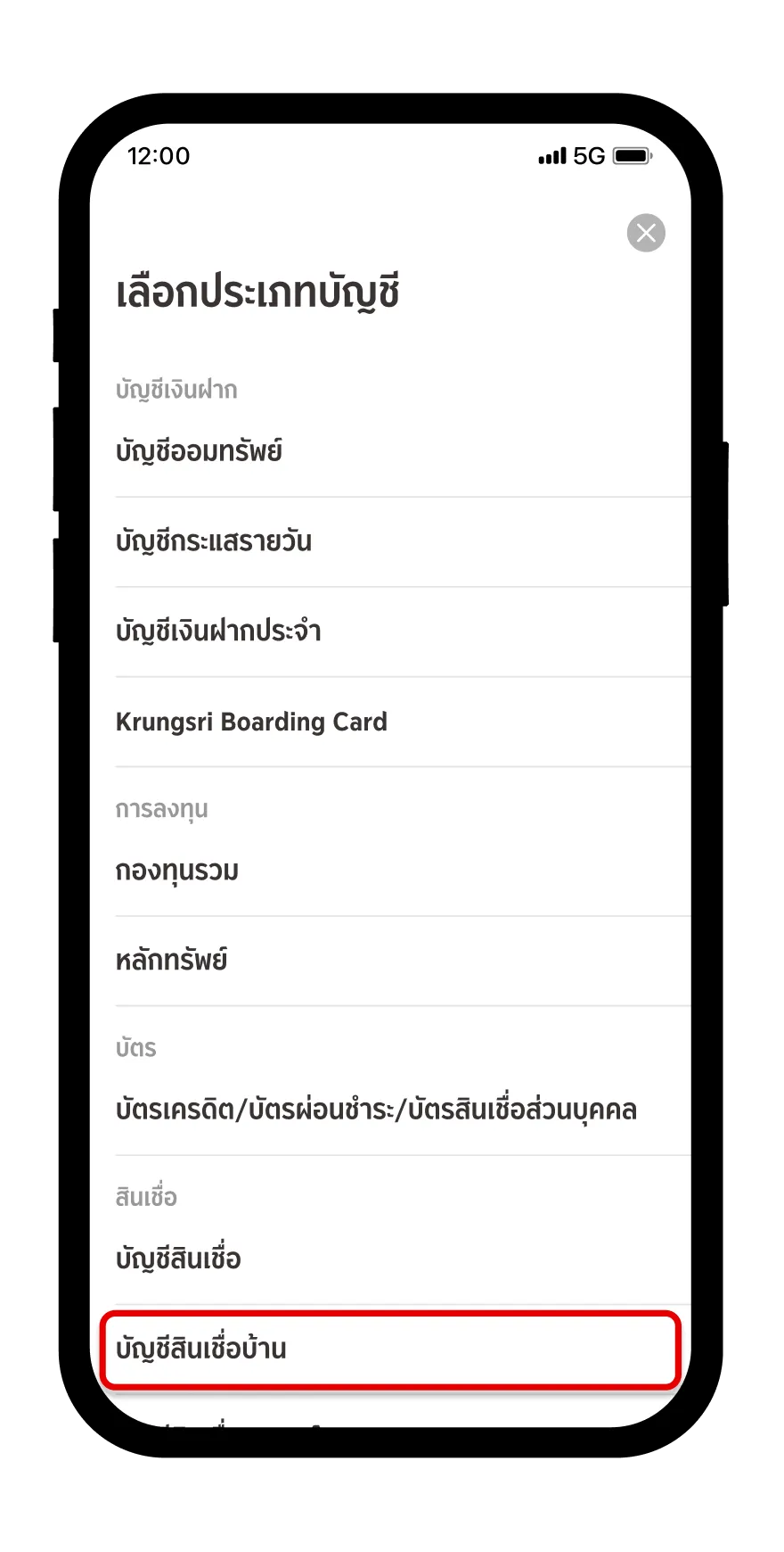เลือกบัญชีสำหรับการขอสินเชื่อ