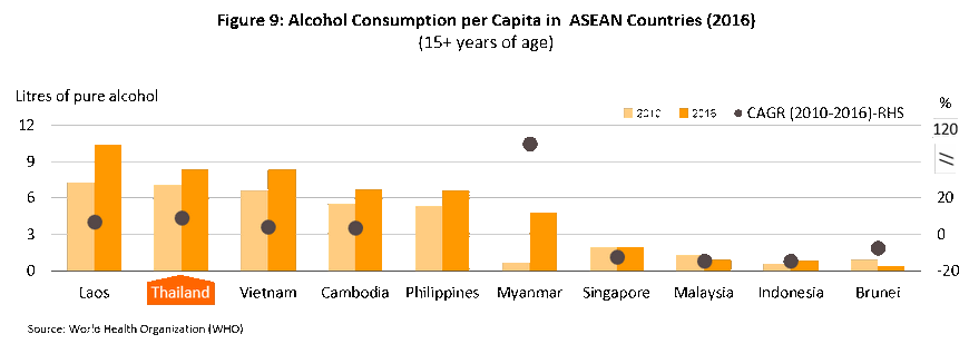ตลาดเครื่องดื่มแอลกอฮอล์ในไทย แม้การบริโภคต่อหัวจะมีปริมาณสูงเป็นอันดับต้นๆ ในภูมิภาคอาเซียน แต่อัตราเติบโตเฉลี่ยไม่สูงนัก (ภาพที่ 9) โดยสถานการณ์ในแต่ละช่วงเวลา