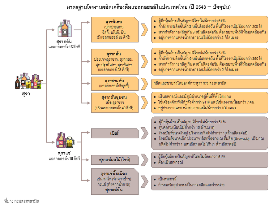 - อุตสาหกรรมเครื่องดื่มแอลกอฮอล์ มีพัฒนาการมาจากการผลิตสุราพื้นบ้าน หรือสุราแช่ (สุราที่เกิดจากการหมักข้าวหรือน้ำตาล) ในยุคแรก (ปี 2470) รัฐเป็นผู้ผูกขาดการผลิตและจำหน่ายสุรา ทำการผลิตสุราขาวที่โรงงานสุราบางยี่ขัน (ขึ้นอยู่กับกรมสรรพสามิต) และมีการพัฒนาผลิตภัณฑ์จากสุราขาว มาผลิตสุราประเภทอื่นเพิ่มเติม อาทิ สุราผสม (ใช้สมุนไพรมาสกัดและแช่ทำสุราดีกรีสูงเป็นน้ำเชื้อ เพื่อนำมาปรุงแต่ง รส กลิ่น สี) และสุราปรุงพิเศษ ต่อมารัฐมีนโยบายให้เอกชนเข้ามาดำเนินการผลิตได้นับจากปี 2502 โดยให้เอกชนประมูลสิทธิดำเนินกิจการโรงงานสุราบางยี่ขันในช่วงปี 2503-2542 หลังจากนั้นเกิดการเปลี่ยนแปลงทางธุรกิจที่สำคัญจากนโยบายเปิดเสรีการผลิตและจำหน่ายสุราในปี 2543 ทำให้มีการลงทุนโรงงานสุราอีกหลายแห่ง รวมทั้งเริ่มมีการผลิตเบียร์ในไทย โดยเป็นการร่วมทุนของทุนไทยและกิจการข้ามชาติ