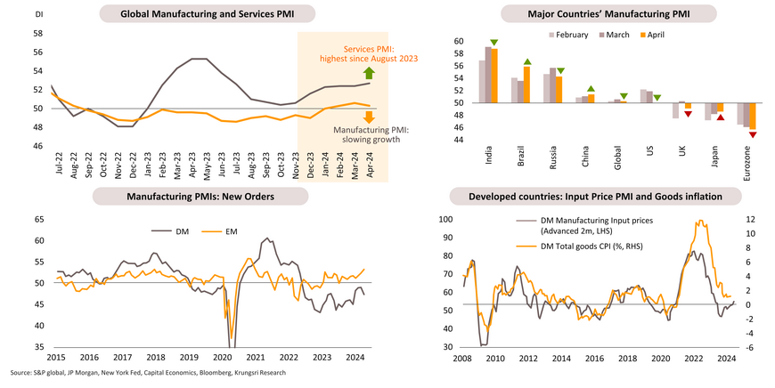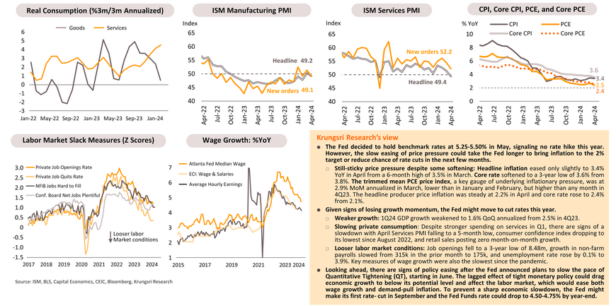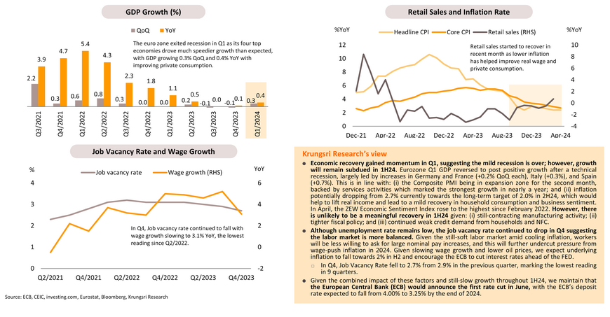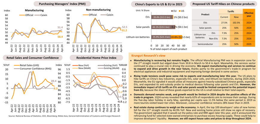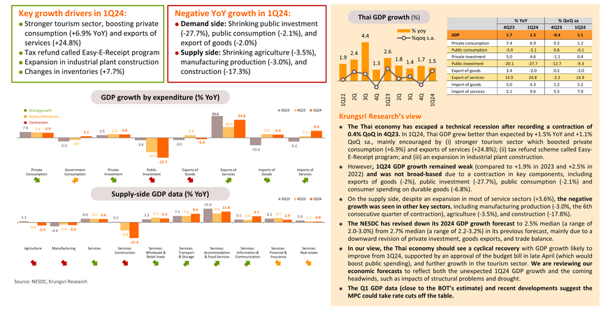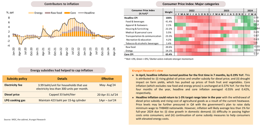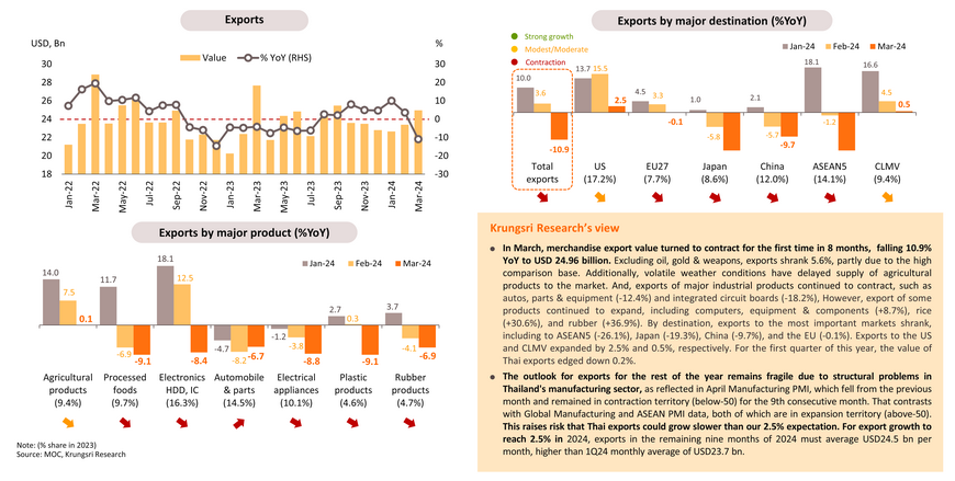 Thailand welcomed 2.76 million foreign tourists in April, slowing down for the second consecutive month despite the Songkran festival. In the first four months of this year, tourist arrivals reached 12.13 million (87% of pre-Covid level vs 71% in 2023) and generated THB584 bn receipts (88% of pre-Covid level vs 63% in 2023) led by Chinese tourists, which made up the largest group but was still only 59% of pre-Covid level. Tourists from Malaysia, Russia, South Korea, and India surged to 104-126% of pre-pandemic levels. In Q2, which marks the low season, tourist arrivals are normally smaller than the previous quarter. To support the ongoing recovery in the tourism sector, the government has extended visa-free program to nationals of Russia, India, and Taiwan, and granted permanent exemptions to tourists from China and Kazakhstan.