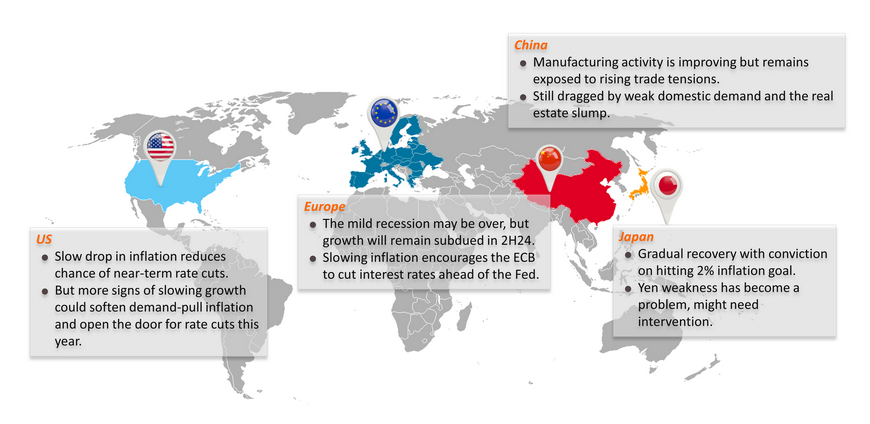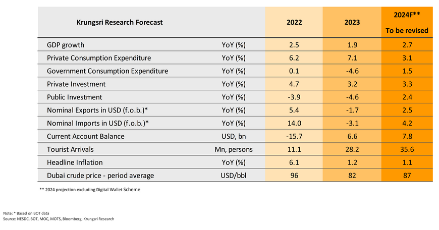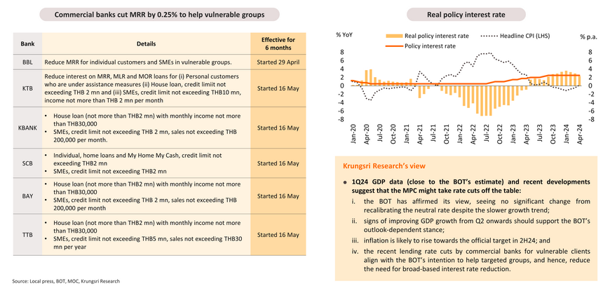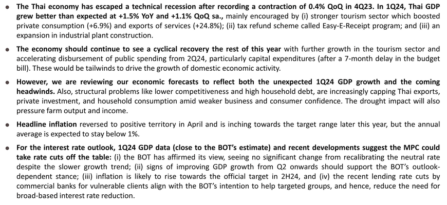 The FY2024 Budget Act took effect in late-April. That suggests budget disbursements, particularly for public investment, would accelerate the rest of this year. Data from the Ministry of Finance show that in the first seven months of FY2024 (October 2023 to April 2024), spending of the current budget reached THB 1.56trn or 56% of the annual current budget, down 5.3% YoY. For the capital budget, only THB 0.116trn has been disbursed for public projects in the first seven months of FY2024, or just 13.8% of the annual capital budget, down 60.4% YoY. Hence, during the remaining 5 months of FY2024 (May to September 2024), the NESDC expects disbursements, especially from the investment budget, to accelerate and inject THB510 bn into the economy. In addition, the government has set the preliminary FY2025 capital budget at over THB900 bn and would start disbursements this October (the first month of FY2025).