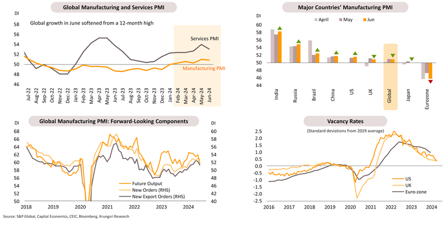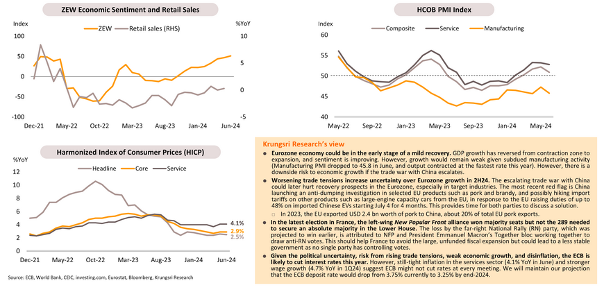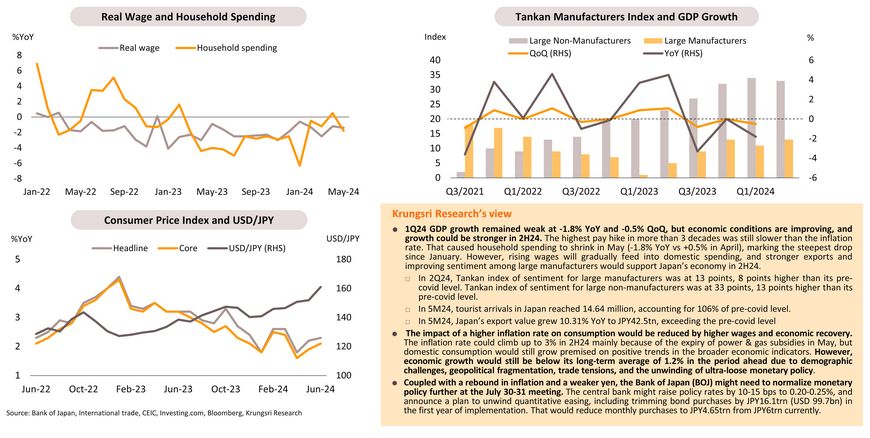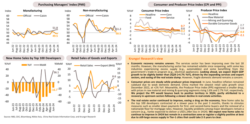 Thailand welcomed 2.74 mn foreign tourists in June, marking a slight improvement from May (+4.0%), driven by the extended free-visa measure and Pride Month celebration. In the first half of 2024, tourist arrivals reached 17.5 mn (89% of pre-Covid level vs 71% in 2023) and generated THB 826bn receipts (91% of pre-Covid level vs 63% in 2023) led by Chinese tourists which made up the largest group; however, they are only 61% of the pre-Covid level. Tourists from Malaysia, India, Russia, and South Korea surged to 103-126% of pre-Covid levels. We maintain foreign tourist arrivals at 35.6 mn for this year, supported by the decision to extend visa-free visits for tourists from 93 countries (vs only 57 countries in 1H24), and increasing flight routes and frequencies from target tourist countries such as India.