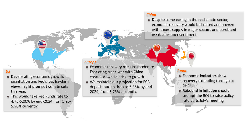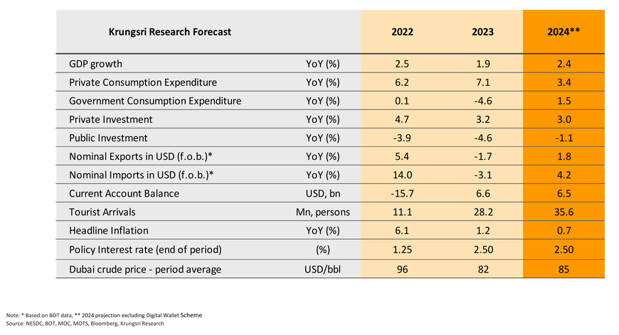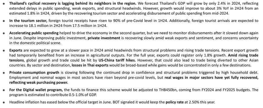 We expect 2024 GDP growth at mark only +2.4%, reflecting longer-than-expected delays in public spending, weak exports, and structural headwinds. However, growth would improve to 3% y-o-y in 2H24 from an estimated 1.8% in 1H24. The Thai economy would see a cyclical recovery with further growth in the tourism sector and accelerating disbursement of public spending from mid-2024, particularly capital expenditures (after a 7-month delay in approving the Budget Bill).