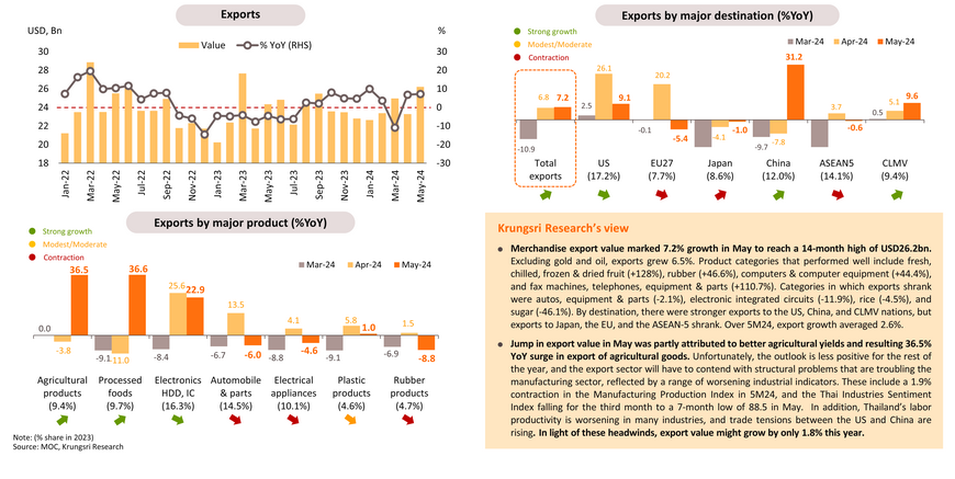 In the first five months of this year, Thai exports grew 2.6% YoY led by agricultural products which increased by 4.7% (including rice, rubber, and fruit). Exports of industrial products (computers & parts, and plastic products) expanded by 2.4%, while exports of agro-industrial products (rubber products, tapioca products, and sugar) fell by 1.3%. Exports remained weak in many Thai industries (including cars & parts, electronic ICs, chemical products, and plastic resin), reflecting structural problems in Thailand's industrial production sector. Although there are some positive signs with rising exports from key Asian countries, we expect Thai exports to grow slowly the rest of this year due to weak manufacturing activity and the impact of trade tensions.