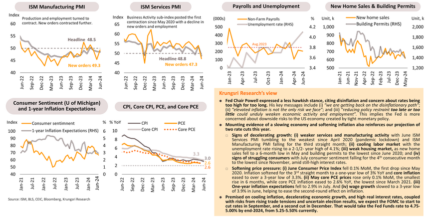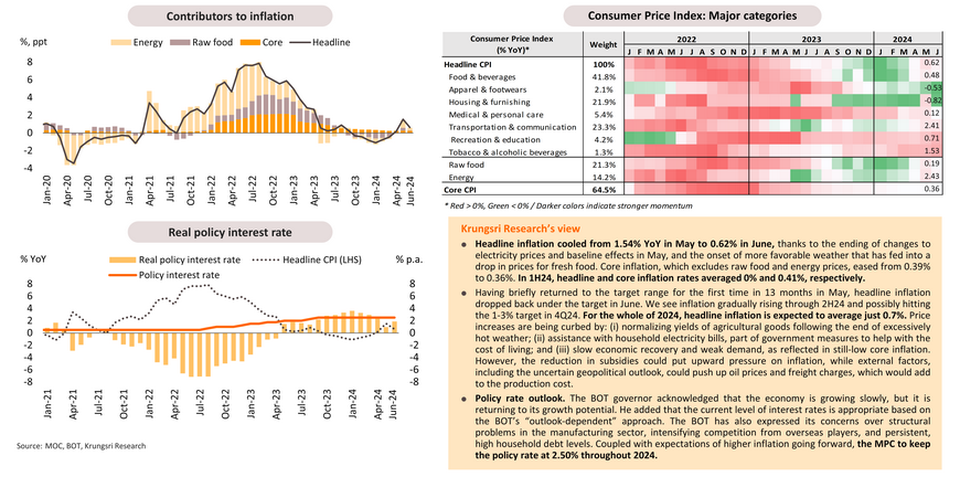 The private consumption index improved slightly in May (+1.2% YoY and +0.3% mom sa). Spending on services increased led by the tourism sector, while spending on non-durable and durable goods contracted. For the rest of this year, private consumption would continue to be supported by (i) the improving tourism sector following recent measures to stimulate tourist spending in secondary cities in Thailand; (ii) measures to reduce energy bills; (iii) a program to reduce lending rates to help vulnerable groups; and (iv) the end of El Niño (characterized by dry weather) in the middle of this year, which should improve farm output and income. However, the consumer confidence index has dropped for the fourth consecutive month in June to a 9-month low. Coupled with structural issues arising from weaker employment in manufacturing and elevated household debt levels, they will drag consumption growth. As of end-1Q24, household debt stood at THB16.37trn, which is 90.8% of GDP.