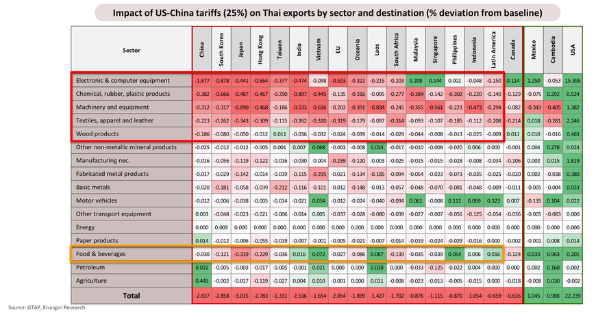 For the global economy, the 25% tariff hikes by US-China would reduce global economic growth by 0.09% and exports by 0.57%, from the baseline. US-China tariff hikes would hurt both countries’ exports (China -5.76%, US -3.26%) and GDP (China -0.50%, US -0.25%). Thailand and other Asian countries could benefit from trade diversion and longer-term relocation of production bases, but gains would be small because their countries would also be hurt by the weaker global trade and economy.